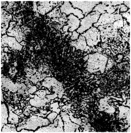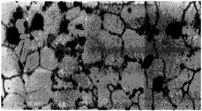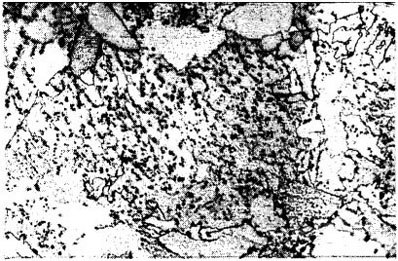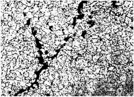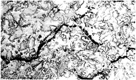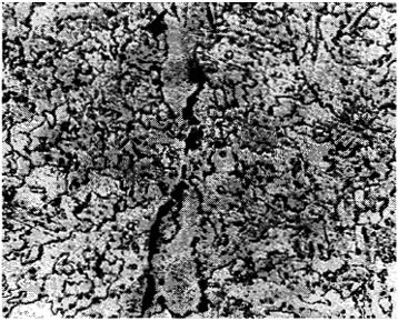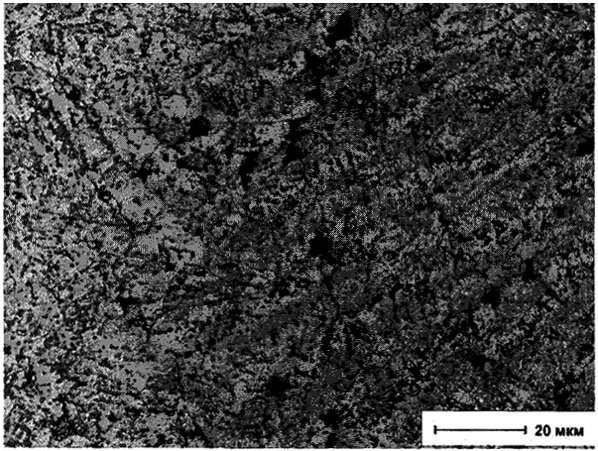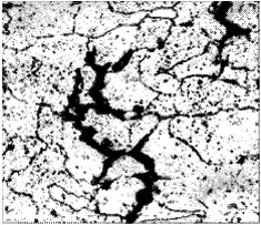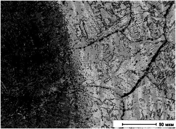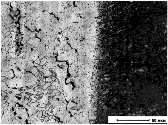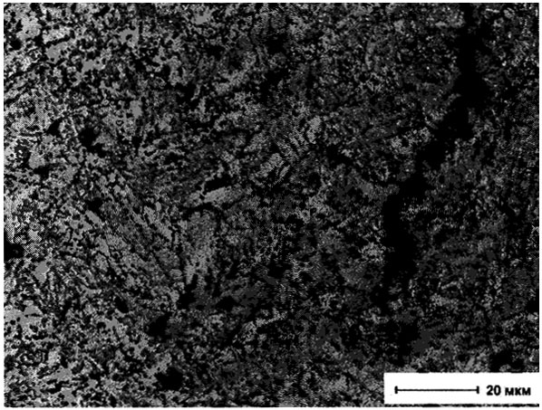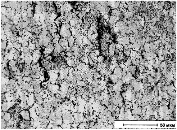 Четко выраженные ликвационные прослойки, занимающие более половины границ дендритных зерен, с локализацией разветвленной системы микротрещин технологического происхождения |