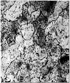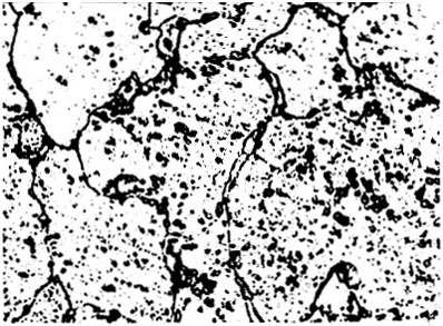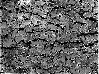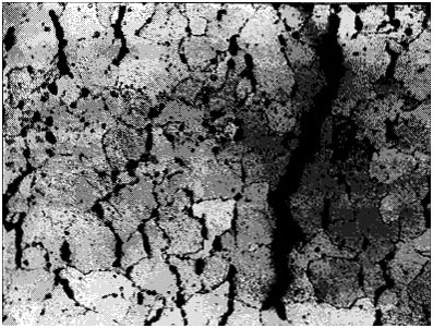 Цепочки пор и слившиеся поры и/или микротрещины длиной до 10 - 20 мкм по границам зерен |