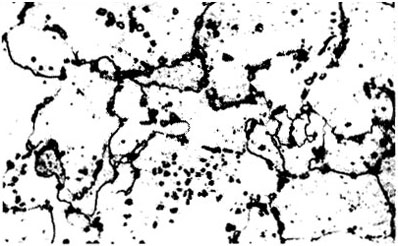 Четко выраженные ликвационные прослойки, занимающие более половины границ дендритных зерен, с дефектами типа микротрещин технологического происхождения |
