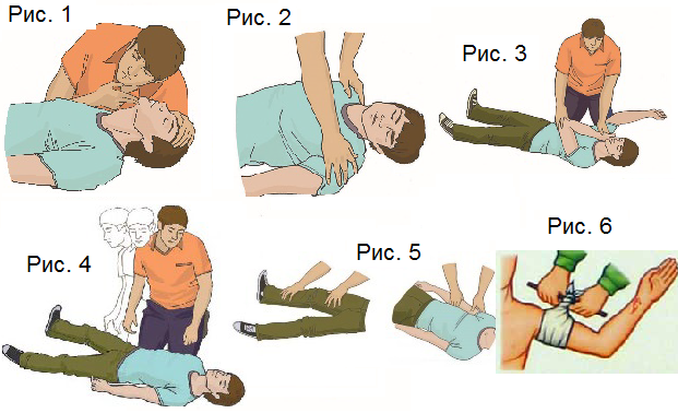 Установите соответствие между мероприятиями по оказанию первой помощи и действиями, изображенными на рисунках: